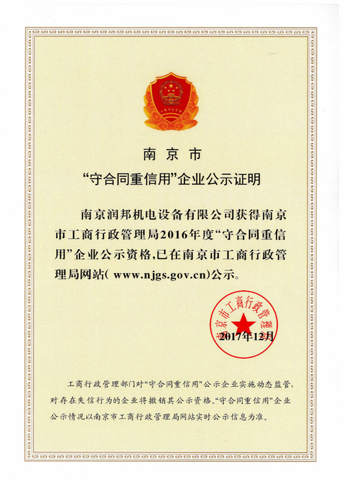 2017年12月29日,接到南京市企業(yè)信用管理協(xié)會通知,潤邦公司再次通過2016年度市級“守合同重信用”企業(yè)的認定。